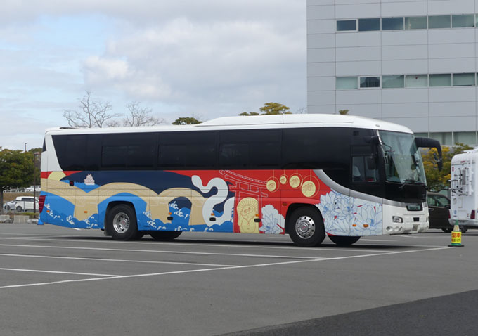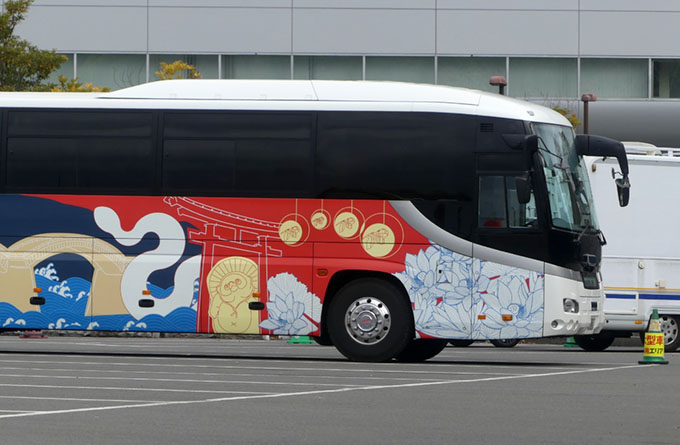 水辺の森公園駐車場に白い蛇が描かれているバスを発見しました